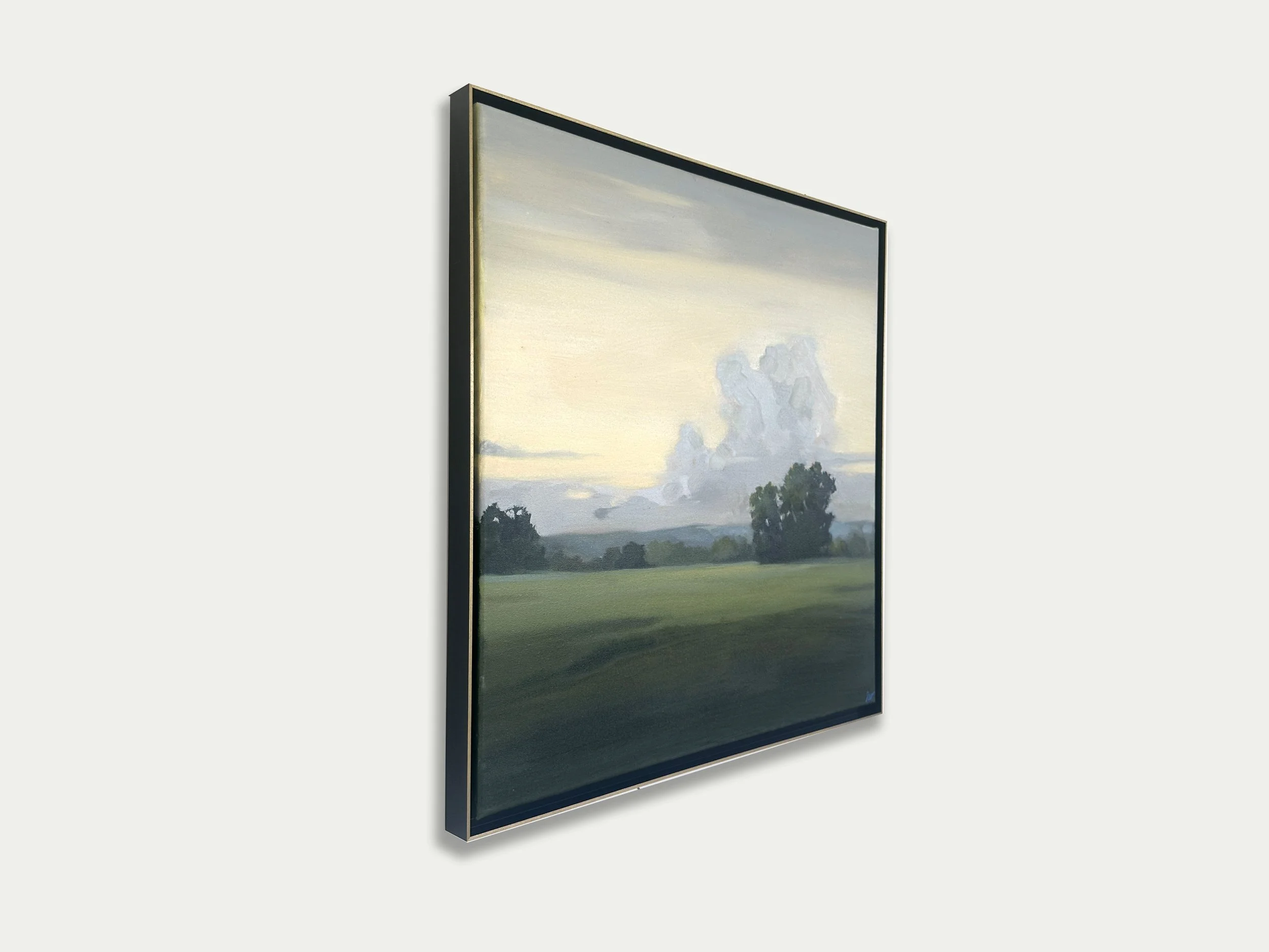 Original oil painting on gallery wrapped canvas. Framed in a thin floating frame with gold face and black sides. Ready to hang.