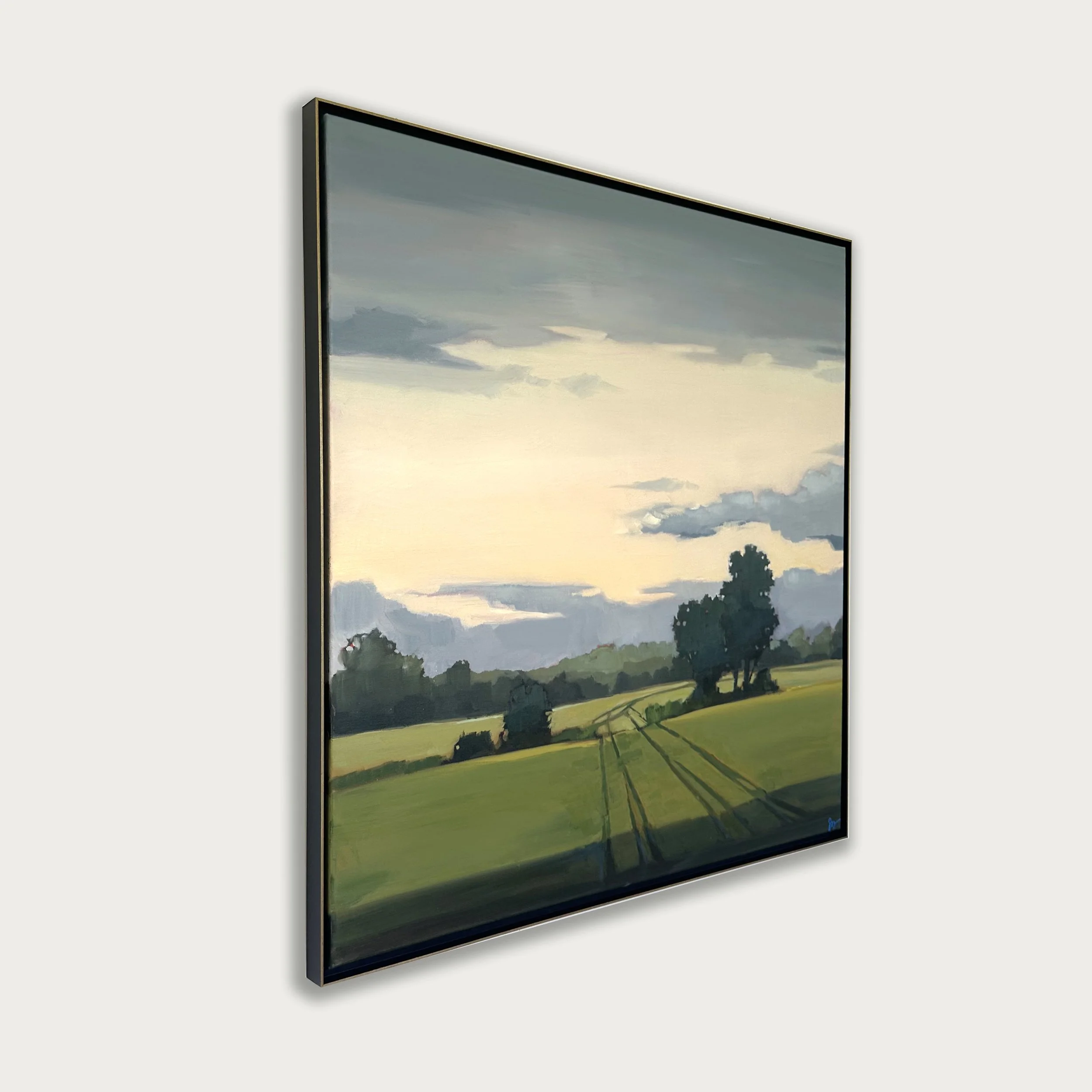 Original oil landscape on gallery wrapped canvas. Framed in a thin floating frame with gold face and black sides. Ready to hang.