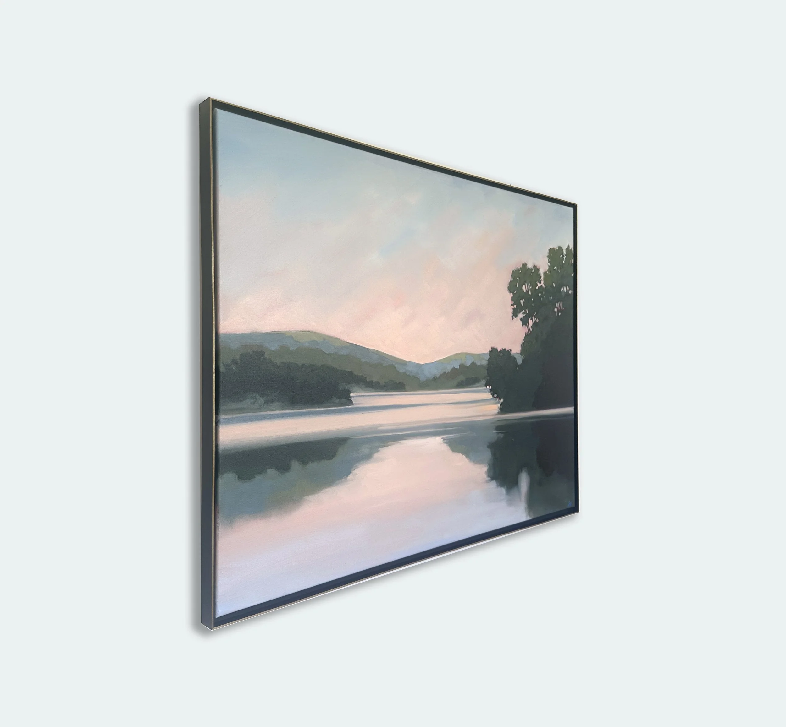 Original landscape painted on gallery wrapped canvas. Framed in a thin floatinlg frame with a gold face and dark sides. Ready to hang.
