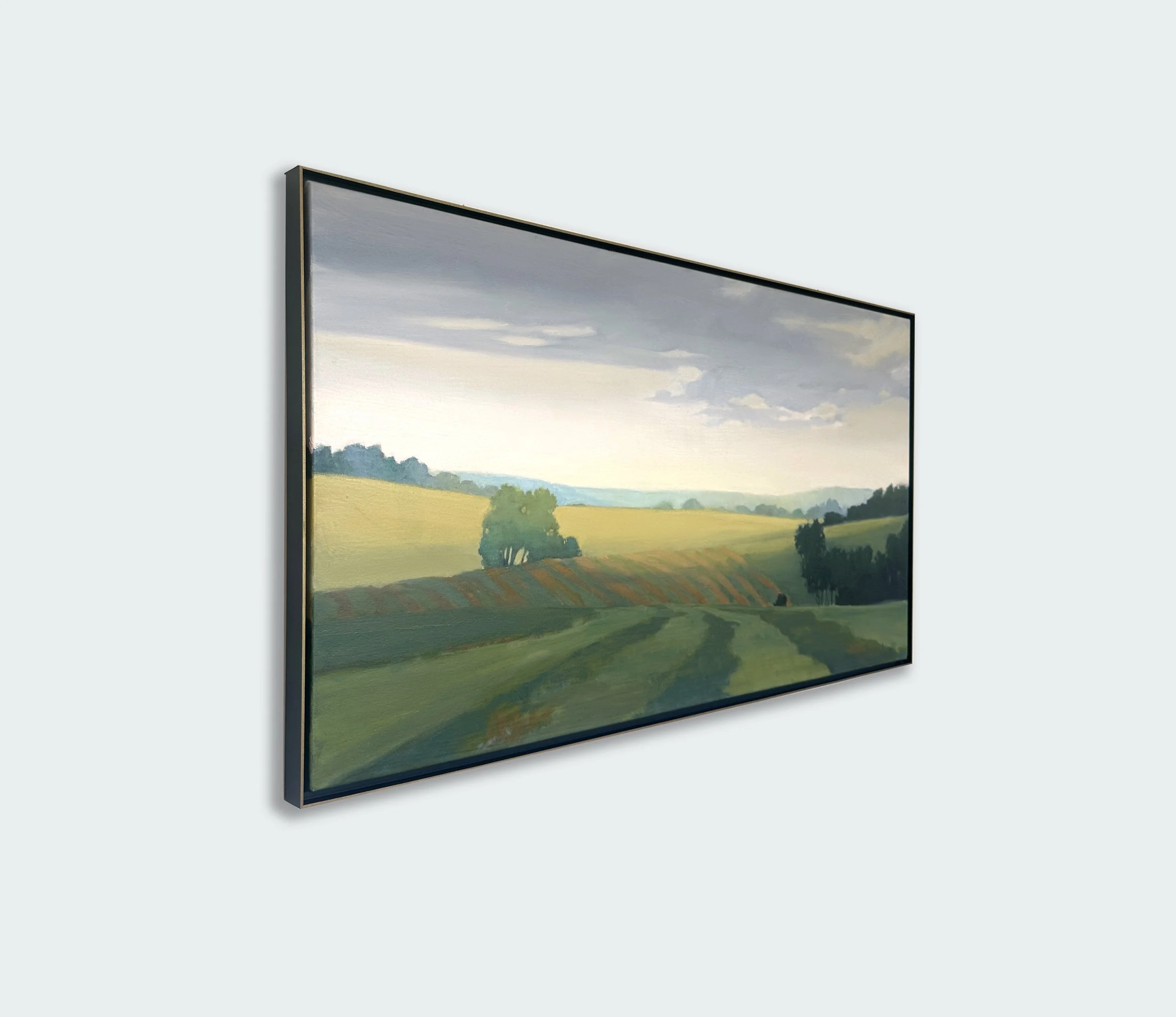 Original landscape painting on gallery wrapped canvas. Framed in a thin floating frame with gold face and dark sides. Ready to hang.